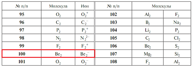 Задачи 95-108 (табл. 1.9). Используя метод молекулярных орбиталей, изобразите энергетические диаграммы молекул и молекулярных ионов, определите порядок связи, сравните прочность связи, укажите характер магнитных свойств частиц..