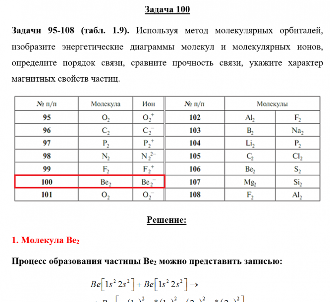 Задачи 95-108 (табл. 1.9). Используя метод молекулярных орбиталей, изобразите энергетические диаграммы молекул и молекулярных ионов, определите порядок связи, сравните прочность связи, укажите характер магнитных свойств частиц.