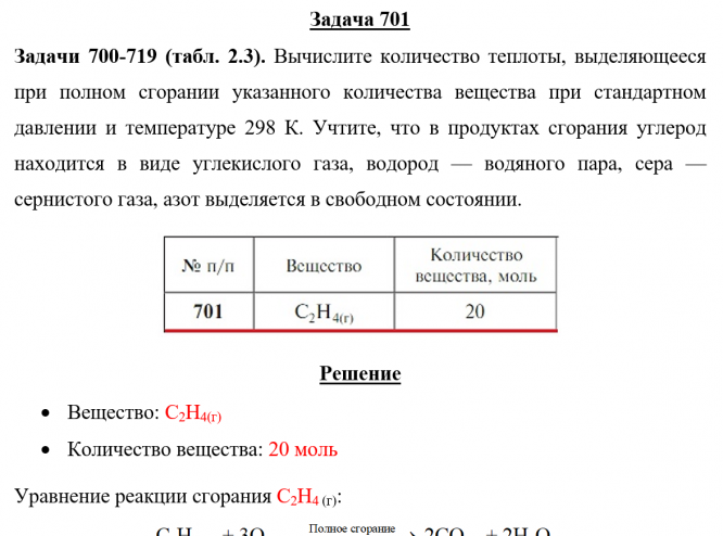 Задача 701 - Вычислите количество теплоты, выделяющееся при полном сгорании указанного количества вещества при стандартном давлении и температуре 298 К. Учтите, что в продуктах сгорания углерод находится в виде углекислого газа, водород — водяного па