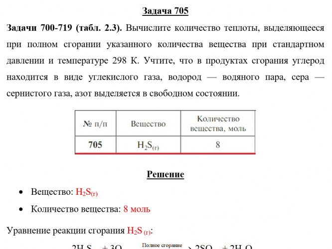 Задача 705 - Вычислите количество теплоты, выделяющееся при полном сгорании указанного количества вещества при стандартном давлении и температуре 298 К. Учтите, что в продуктах сгорания углерод находится в виде углекислого газа, водород — водяного па