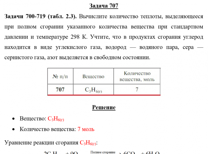 Задача 707 - Вычислите количество теплоты, выделяющееся при полном сгорании указанного количества вещества при стандартном давлении и температуре 298 К. Учтите, что в продуктах сгорания углерод находится в виде углекислого газа, водород — водяного па