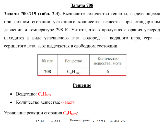 Задача 708 - Вычислите количество теплоты, выделяющееся при полном сгорании указанного количества вещества при стандартном давлении и температуре 298 К. Учтите, что в продуктах сгорания углерод находится в виде углекислого газа, водород — водяного па