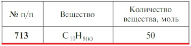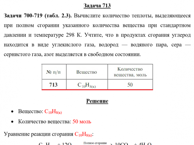 Задача 713 - Вычислите количество теплоты, выделяющееся при полном сгорании указанного количества вещества при стандартном давлении и температуре 298 К. Учтите, что в продуктах сгорания углерод находится в виде углекислого газа, водород — водяного па