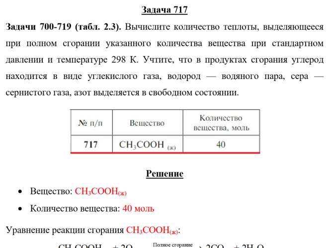 Для студентов по предмету ХимияЗадача 717 - Вычислите количество теплоты, выделяющееся при полном сгорании указанного количества вещества при стандартном давлении и температуре 298 Задача 717 - Вычислите количество теплоты, выделяющееся при полном сгорании указанного количества вещества при стандартном давлении и температуре 298