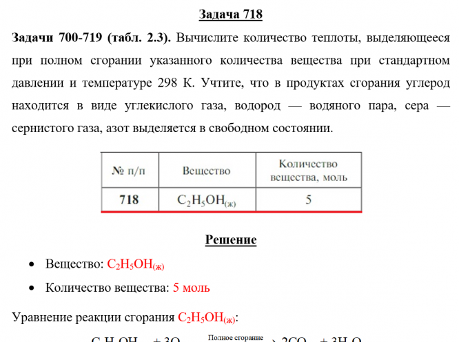 Задача 718 - Вычислите количество теплоты, выделяющееся при полном сгорании указанного количества вещества при стандартном давлении и температуре 298 К. Учтите, что в продуктах сгорания углерод находится в виде углекислого газа, водород — водяного па