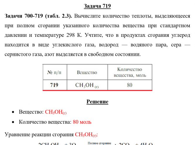 Задача 719 - Вычислите количество теплоты, выделяющееся при полном сгорании указанного количества вещества при стандартном давлении и температуре 298 К. Учтите, что в продуктах сгорания углерод находится в виде углекислого газа, водород — водяного па