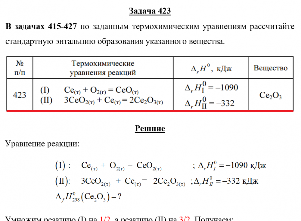 Задача 423: Задача 423 - По заданным термохимическим уравнениям рассчитайте стандартную энтальпию образования указанного вещества.
