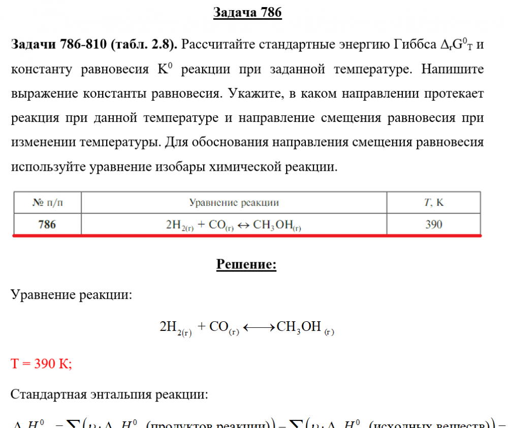 Задача 786 - Рассчитайте стандартные энергию Гиббса ΔrG0T и константу равновесия K0 реакции при заданной температуре. Напишите выражение константы равновесия. Укажите, в каком направлении протекает реакция при данной температуре и направление смещени