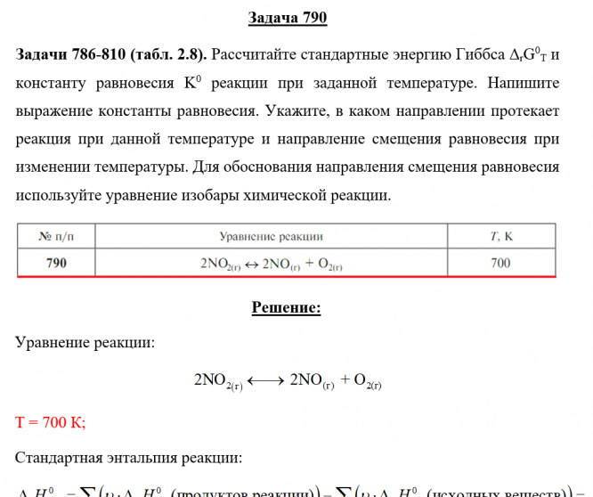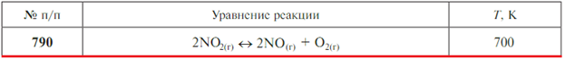Задача 790 - Рассчитайте стандартные энергию Гиббса ΔrG0T и константу равновесия K0 реакции при заданной температуре. Напишите выражение константы равновесия. Укажите, в каком направлении протекает реакция при данной температуре и направление смещени
