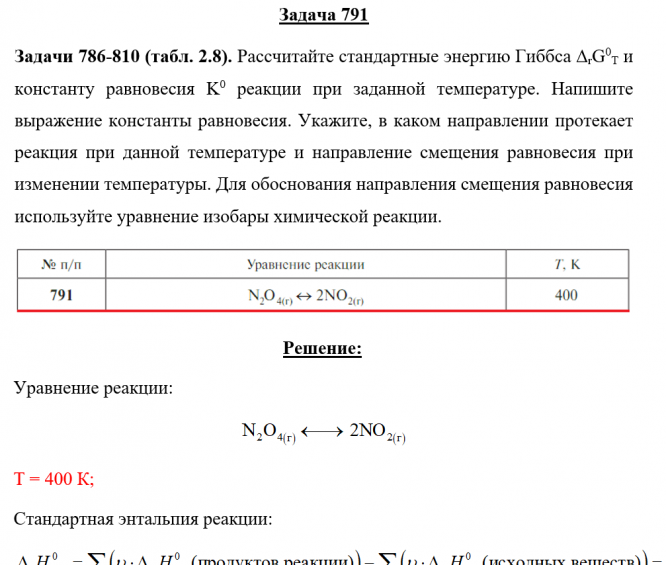 Задача 791 - Рассчитайте стандартные энергию Гиббса ΔrG0T и константу равновесия K0 реакции при заданной температуре. Напишите выражение константы равновесия. Укажите, в каком направлении протекает реакция при данной температуре и направление смещени