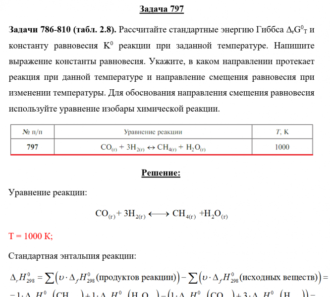 Задача 797 - Рассчитайте стандартные энергию Гиббса ΔrG0T и константу равновесия K0 реакции при заданной температуре. Напишите выражение константы равновесия. Укажите, в каком направлении протекает реакция при данной температуре и направление смещени