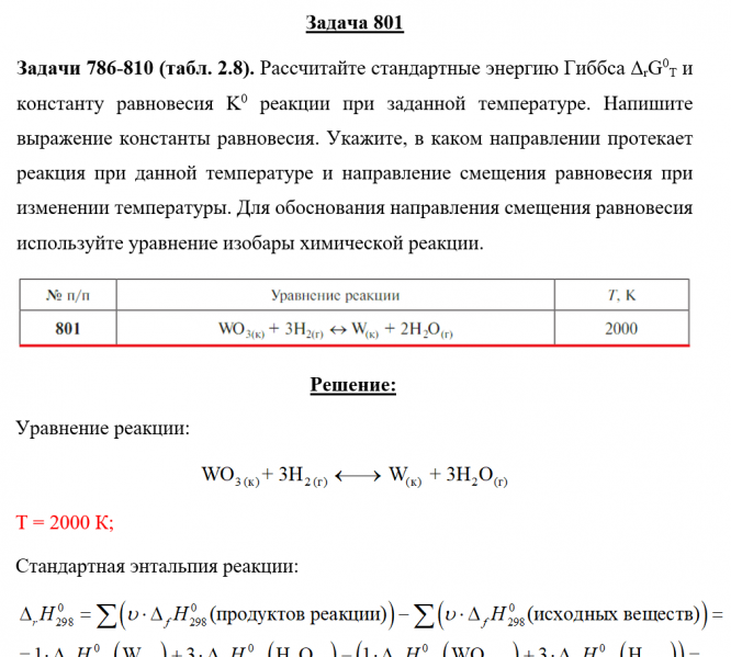 Задача 801 - Рассчитайте стандартные энергию Гиббса ΔrG0T и константу равновесия K0 реакции при заданной температуре. Напишите выражение константы равновесия. Укажите, в каком направлении протекает реакция при данной температуре и направление смещени
