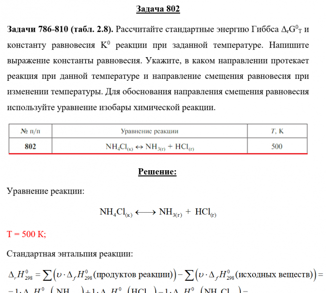 Задача 802 - Рассчитайте стандартные энергию Гиббса ΔrG0T и константу равновесия K0 реакции при заданной температуре. Напишите выражение константы равновесия. Укажите, в каком направлении протекает реакция при данной температуре и направление смещени