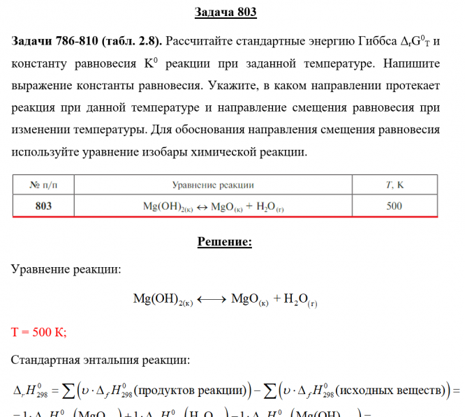 Задача 803 - Рассчитайте стандартные энергию Гиббса ΔrG0T и константу равновесия K0 реакции при заданной температуре. Напишите выражение константы равновесия. Укажите, в каком направлении протекает реакция при данной температуре и направление смещени
