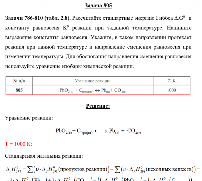 Задача 805 - Рассчитайте стандартные энергию Гиббса ΔrG0T и константу равновесия K0 реакции при заданной температуре. Напишите выражение константы равновесия. Укажите, в каком направлении протекает реакция при данной температуре и направление смещени