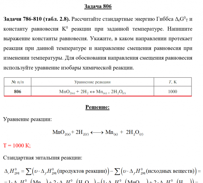 Задача 806 - Рассчитайте стандартные энергию Гиббса ΔrG0T и константу равновесия K0 реакции при заданной температуре. Напишите выражение константы равновесия. Укажите, в каком направлении протекает реакция при данной температуре и направление смещени