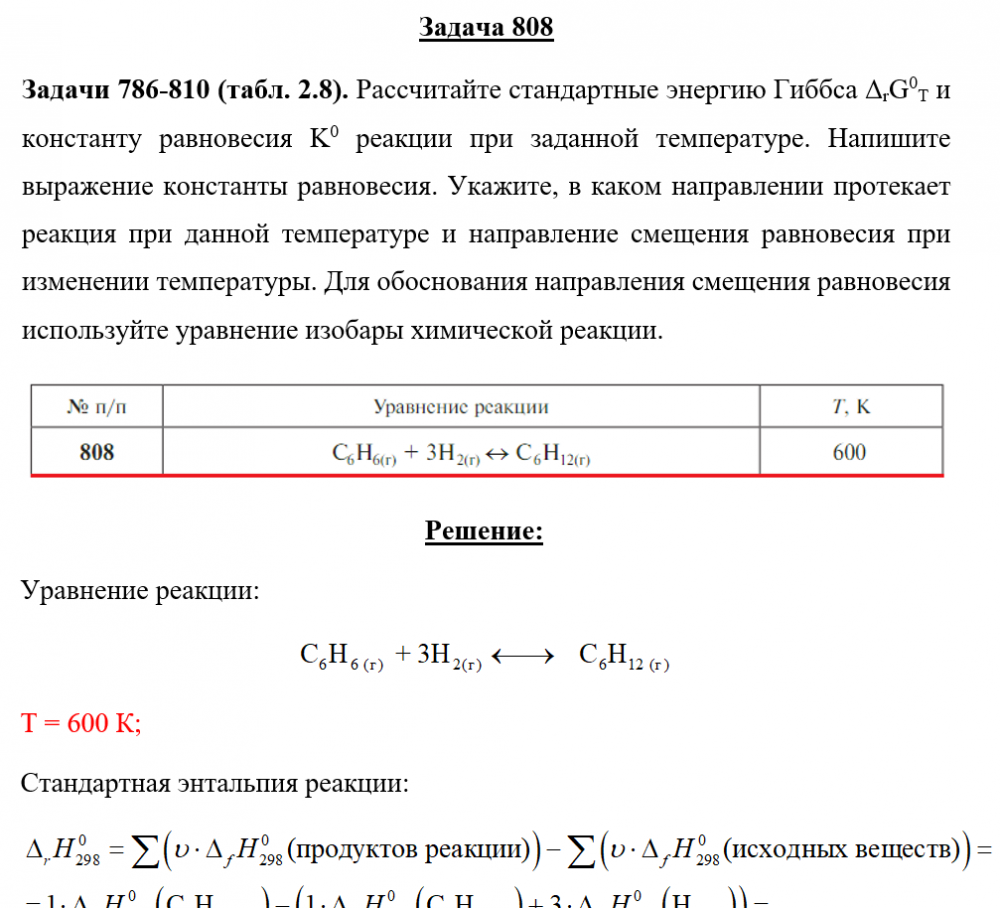 Задача 808 - Рассчитайте стандартные энергию Гиббса ΔrG0T и константу равновесия K0 реакции при заданной температуре. Напишите выражение константы равновесия. Укажите, в каком направлении протекает реакция при данной температуре и направление смещени
