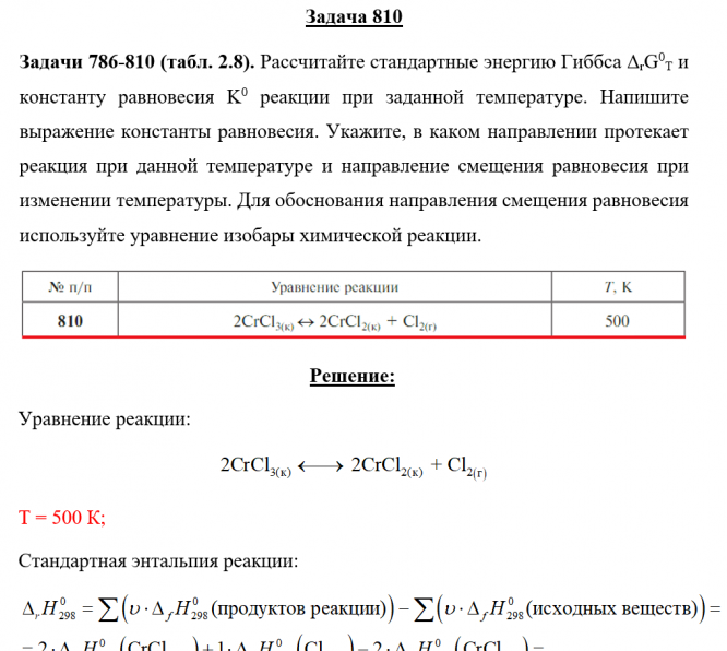 Главная » Учебные материалы » Химия » Решения задач » Несколько классов/семестров » Номер 810 » Задача 810 - Рассчитайте стандартные энергию Гиббса ΔrG0T и константу равновесия K0 реакции при заданной температуре. Напишите выражение константы равновесия. Укажите, в каком направлении протекает реакция при данной температуре и направление смещени