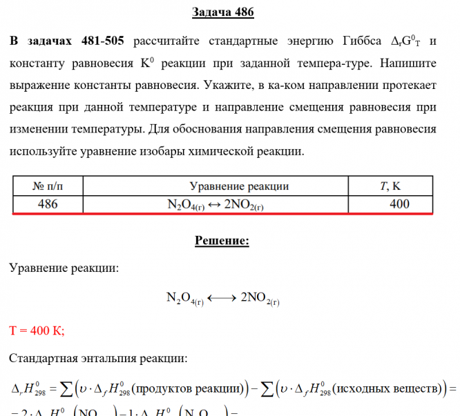 Задача 486 - рассчитайте стандартные энергию Гиббса ΔrG0T и константу равновесия K0 реакции при заданной температуре. Напишите выражение константы равновесия. Укажите, в каком направлении протекает реакция при данной температуре и направление смещени