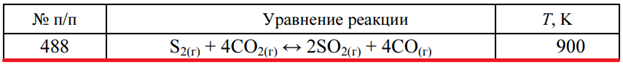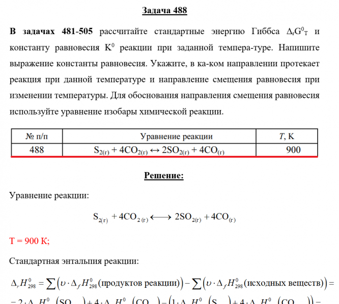 Задача 488 - рассчитайте стандартные энергию Гиббса ΔrG0T и константу равновесия K0 реакции при заданной температуре. Напишите выражение константы равновесия. Укажите, в каком направлении протекает реакция при данной температуре и направление смещени