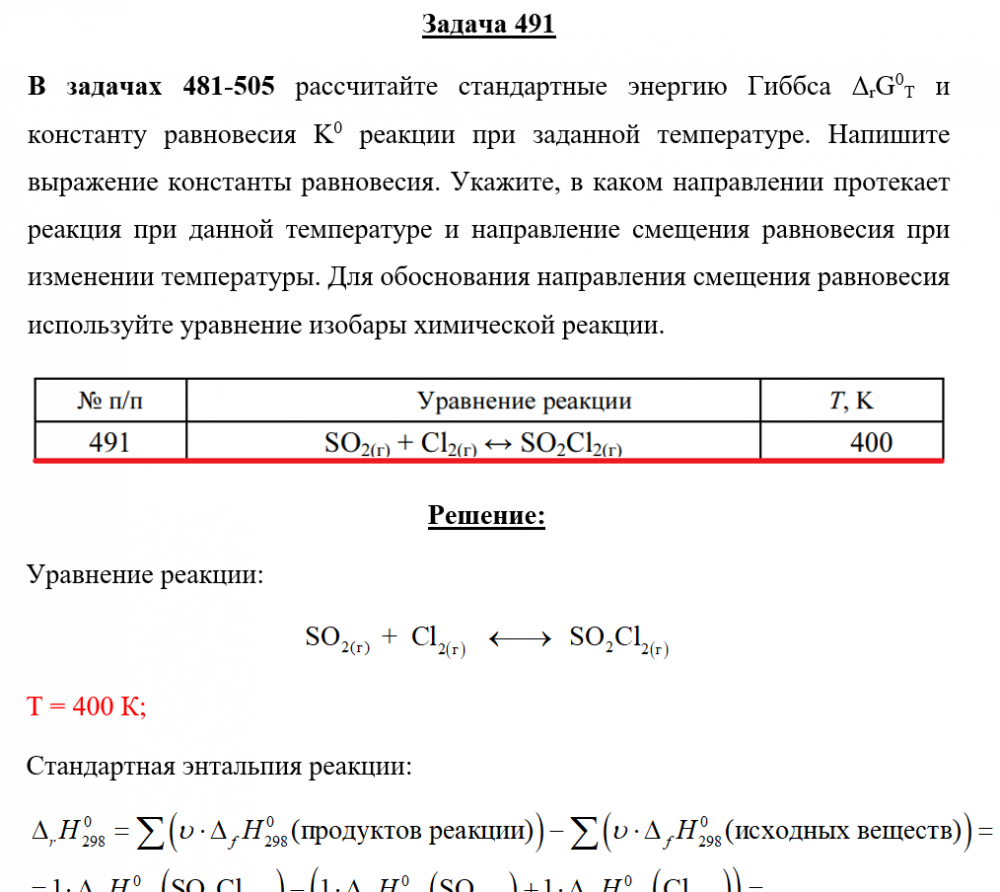 Задача 491 - рассчитайте стандартные энергию Гиббса ΔrG0T и константу равновесия K0 реакции при заданной температуре. Напишите выражение константы равновесия. Укажите, в каком направлении протекает реакция при данной температуре и направление смещени