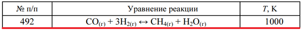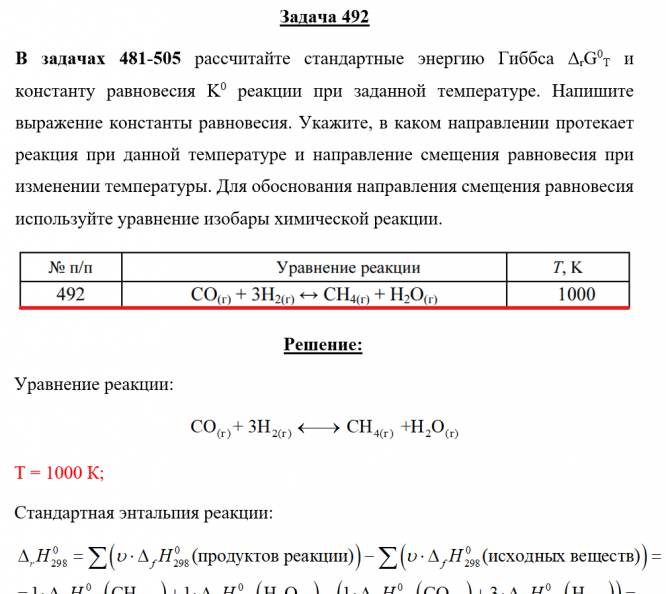Задача 492 - рассчитайте стандартные энергию Гиббса ΔrG0T и константу равновесия K0 реакции при заданной температуре. Напишите выражение константы равновесия. Укажите, в каком направлении протекает реакция при данной температуре и направление смещени