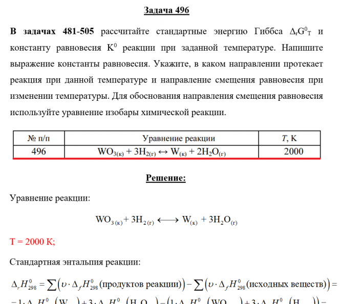 Задача 496 - рассчитайте стандартные энергию Гиббса ΔrG0T и константу равновесия K0 реакции при заданной температуре. Напишите выражение константы равновесия. Укажите, в каком направлении протекает реакция при данной температуре и направление смещени