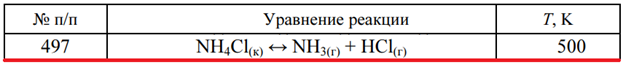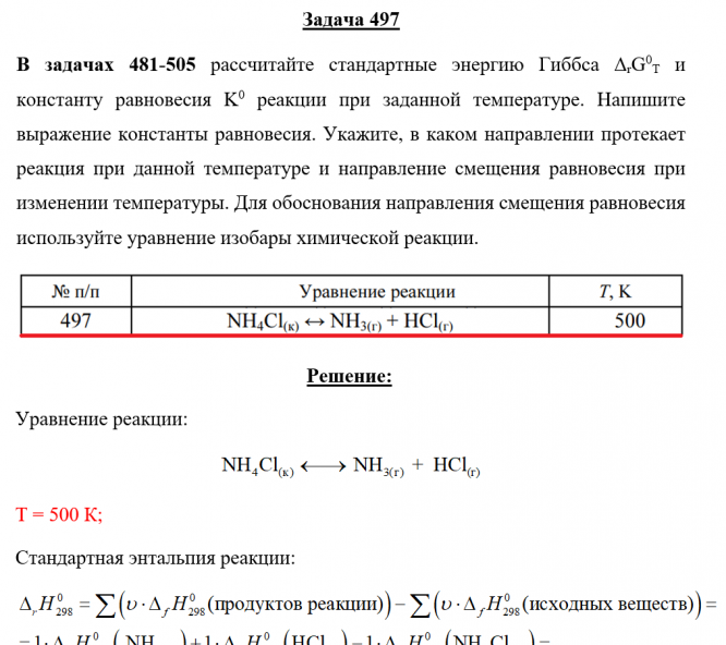 Задача 497 - рассчитайте стандартные энергию Гиббса ΔrG0T и константу равновесия K0 реакции при заданной температуре. Напишите выражение константы равновесия. Укажите, в каком направлении протекает реакция при данной температуре и направление смещени