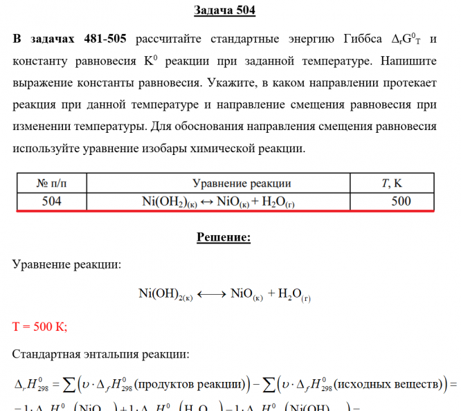 Задача 504 - рассчитайте стандартные энергию Гиббса ΔrG0T и константу равновесия K0 реакции при заданной температуре. Напишите выражение константы равновесия. Укажите, в каком направлении протекает реакция при данной температуре и направление смещени