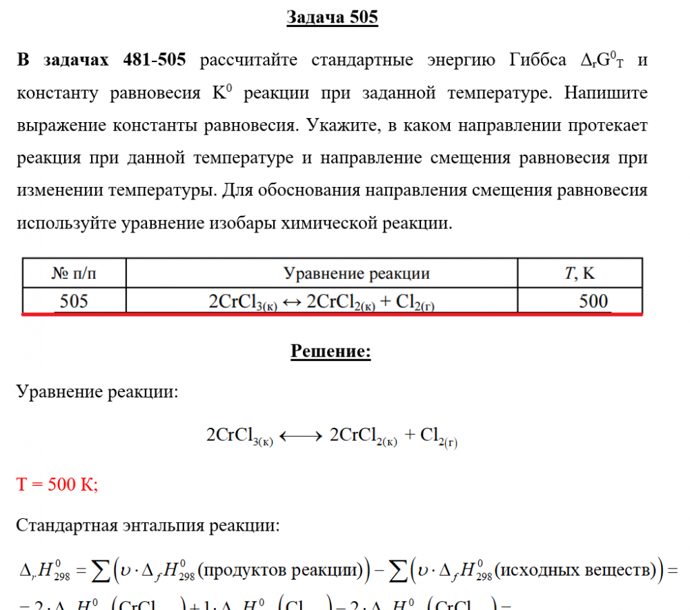Задача 505 - рассчитайте стандартные энергию Гиббса ΔrG0T и константу равновесия K0 реакции при заданной температуре. Напишите выражение константы равновесия. Укажите, в каком направлении протекает реакция при данной температуре и направление смещени