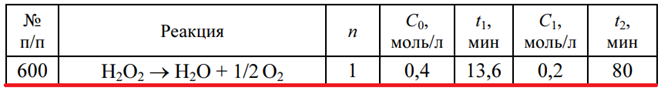 Главная » Учебные материалы » Химия » Решения задач » Несколько классов/семестров » Номер 600 » Задача 600 - для реакции n-го порядка рассчитайте концентрацию исходных веществ С2 через некоторое время t2 от начала реакции, если известно, что при начальных концентрациях реагентов С0 при постоянной температуре за время t1 концентрация исходных ве