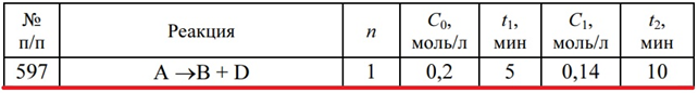 Главная » Учебные материалы » Химия » Решения задач » Несколько классов/семестров » Номер 597 » Задача 597 - для реакции n-го порядка рассчитайте концентрацию исходных веществ С2 через некоторое время t2 от начала реакции, если известно, что при начальных концентрациях реагентов С0 при постоянной температуре за время t1 концентрация исходных ве