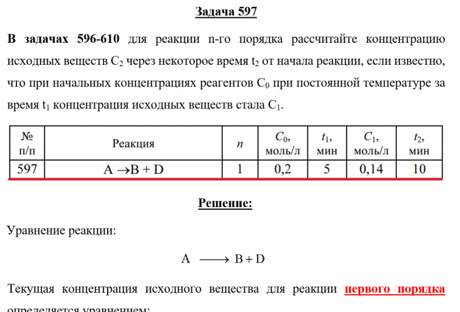 Для студентов по предмету ХимияЗадача 597 - для реакции n-го порядка рассчитайте концентрацию исходных веществ С2 через некоторое время t2 от начала реакции, если известно, что при Задача 597 - для реакции n-го порядка рассчитайте концентрацию исходных веществ С2 через некоторое время t2 от начала реакции, если известно, что при