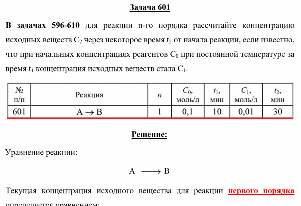 Для студентов по предмету ХимияЗадача 601 - для реакции n-го порядка рассчитайте концентрацию исходных веществ С2 через некоторое время t2 от начала реакции, если известно, что при Задача 601 - для реакции n-го порядка рассчитайте концентрацию исходных веществ С2 через некоторое время t2 от начала реакции, если известно, что при
