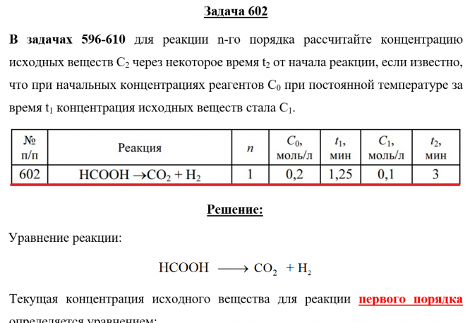 Для студентов по предмету ХимияЗадача 602 - для реакции n-го порядка рассчитайте концентрацию исходных веществ С2 через некоторое время t2 от начала реакции, если известно, что при Задача 602 - для реакции n-го порядка рассчитайте концентрацию исходных веществ С2 через некоторое время t2 от начала реакции, если известно, что при