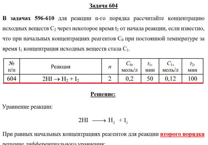 Для студентов по предмету ХимияЗадача 604 - для реакции n-го порядка рассчитайте концентрацию исходных веществ С2 через некоторое время t2 от начала реакции, если известно, что при Задача 604 - для реакции n-го порядка рассчитайте концентрацию исходных веществ С2 через некоторое время t2 от начала реакции, если известно, что при