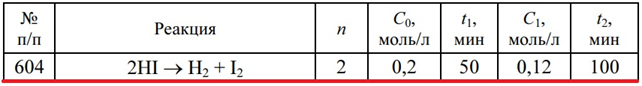 Задача 604 - для реакции n-го порядка рассчитайте концентрацию исходных веществ С2 через некоторое время t2 от начала реакции, если известно, что при начальных концентрациях реагентов С0 при постоянной температуре за время t1 концентрация исходных ве