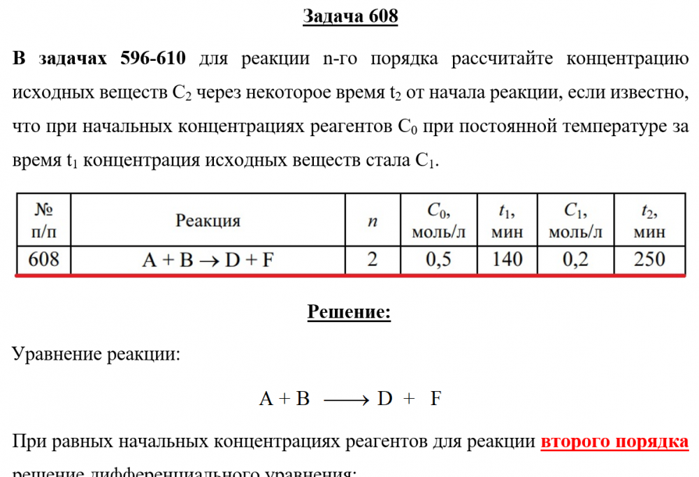 Задача 608 - для реакции n-го порядка рассчитайте концентрацию исходных веществ С2 через некоторое время t2 от начала реакции, если известно, что при начальных концентрациях реагентов С0 при постоянной температуре за время t1 концентрация исходных ве