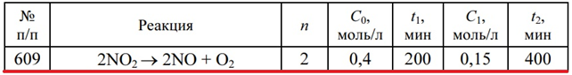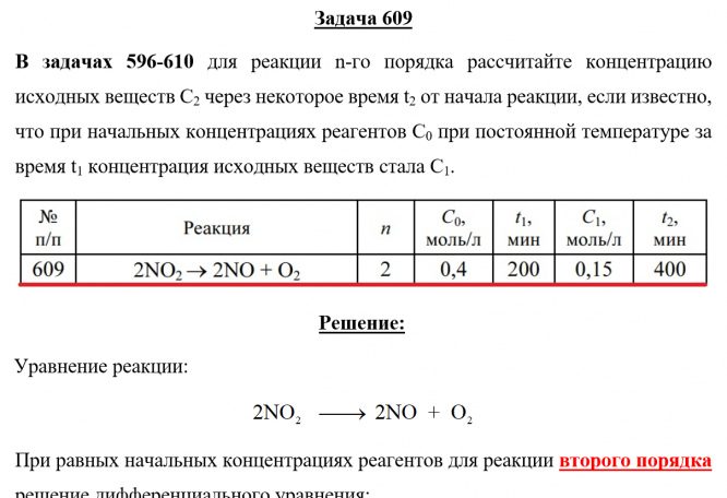 Задача 609 - для реакции n-го порядка рассчитайте концентрацию исходных веществ С2 через некоторое время t2 от начала реакции, если известно, что при начальных концентрациях реагентов С0 при постоянной температуре за время t1 концентрация исходных ве