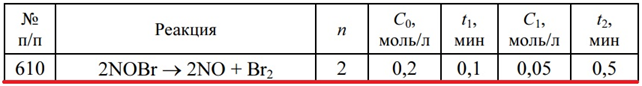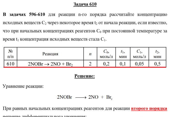 Главная » Учебные материалы » Химия » Решения задач » Несколько классов/семестров » Номер 610 » Задача 610 - для реакции n-го порядка рассчитайте концентрацию исходных веществ С2 через некоторое время t2 от начала реакции, если известно, что при начальных концентрациях реагентов С0 при постоянной температуре за время t1 концентрация исходных ве