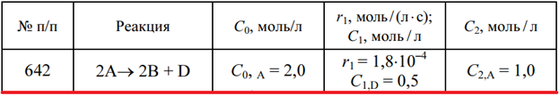 Задача 642 - для данной элементарной реакции рассчитайте скорость реакции r2 при указанной концентрации С2 одного из компонентов, если известны начальные концентрации реагентов С0 и скорость реакции r1 при определенной концентрации одного из компонен