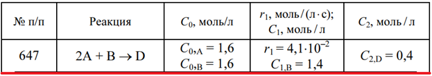 Задача 647 - для данной элементарной реакции рассчитайте скорость реакции r2 при указанной концентрации С2 одного из компонентов, если известны начальные концентрации реагентов С0 и скорость реакции r1 при определенной концентрации одного из компонен