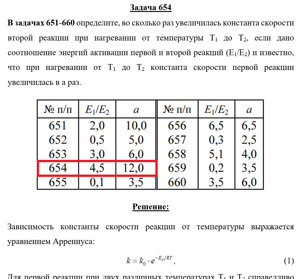 Задача 654 - определите, во сколько раз увеличилась константа скорости второй реакции при нагревании от температуры Т1 до Т2, если дано соотношение энергий активации первой и второй реакций (Е1/Е2) и известно, что при нагревании от Т1 до Т2 константа