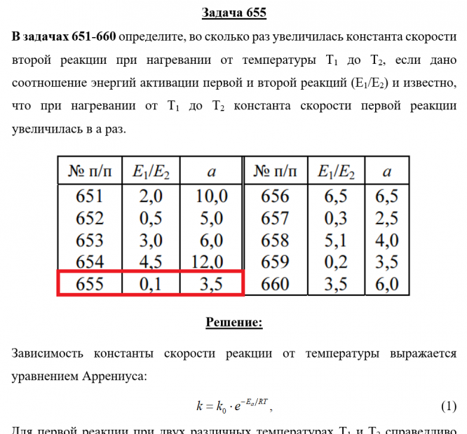 Для студентов по предмету ХимияЗадача 655 - определите, во сколько раз увеличилась константа скорости второй реакции при нагревании от температуры Т1 до Т2, если дано соотношение энЗадача 655 - определите, во сколько раз увеличилась константа скорости второй реакции при нагревании от температуры Т1 до Т2, если дано соотношение эн