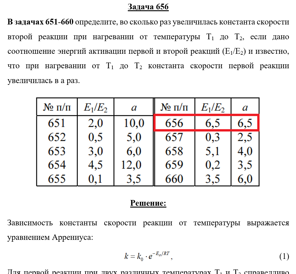Задача 656 - определите, во сколько раз увеличилась константа скорости второй реакции при нагревании от температуры Т1 до Т2, если дано соотношение энергий активации первой и второй реакций (Е1/Е2) и известно, что при нагревании от Т1 до Т2 константа