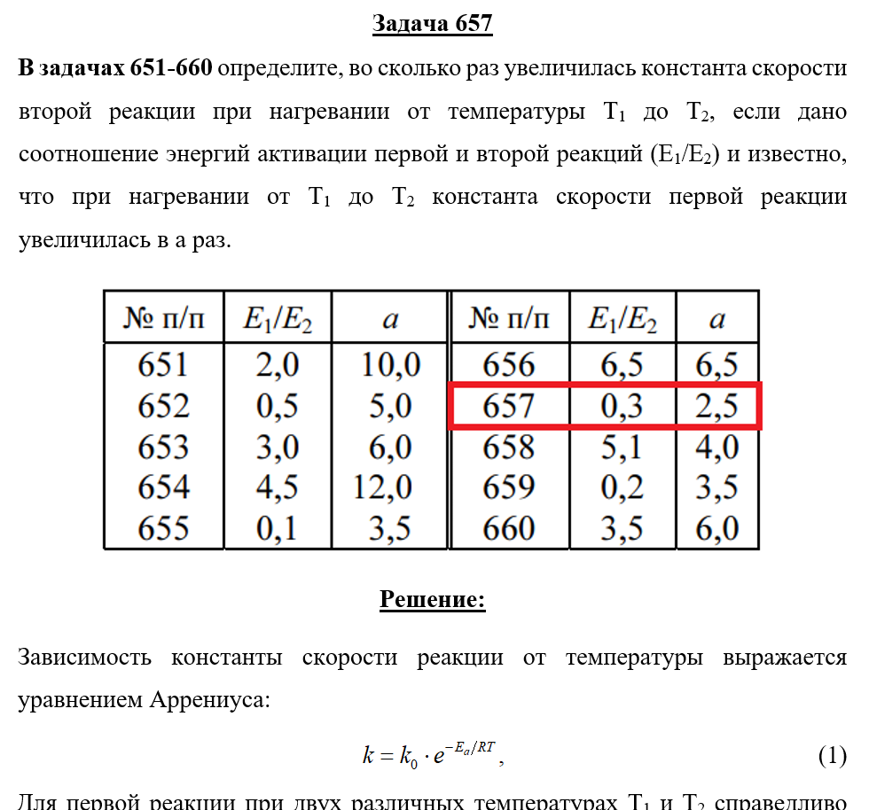 Задача 657 - определите, во сколько раз увеличилась константа скорости второй реакции при нагревании от температуры Т1 до Т2, если дано соотношение энергий активации первой и второй реакций (Е1/Е2) и известно, что при нагревании от Т1 до Т2 константа