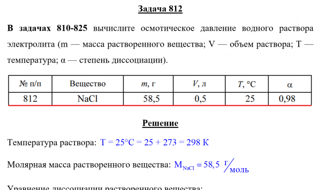 Задача 812 - вычислите осмотическое давление водного раствора электролита (m — масса растворенного вещества; V — объем раствора; Т — температура; α — степень диссоциации).