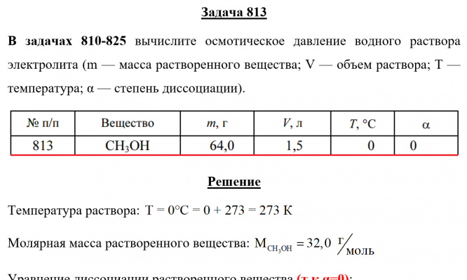 Задача 813 - вычислите осмотическое давление водного раствора электролита (m — масса растворенного вещества; V — объем раствора; Т — температура; α — степень диссоциации).