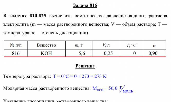 Задача 816 - вычислите осмотическое давление водного раствора электролита (m — масса растворенного вещества; V — объем раствора; Т — температура; α — степень диссоциации).