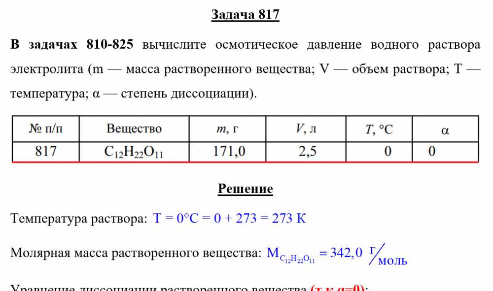 Задача 817 - вычислите осмотическое давление водного раствора электролита (m — масса растворенного вещества; V — объем раствора; Т — температура; α — степень диссоциации).